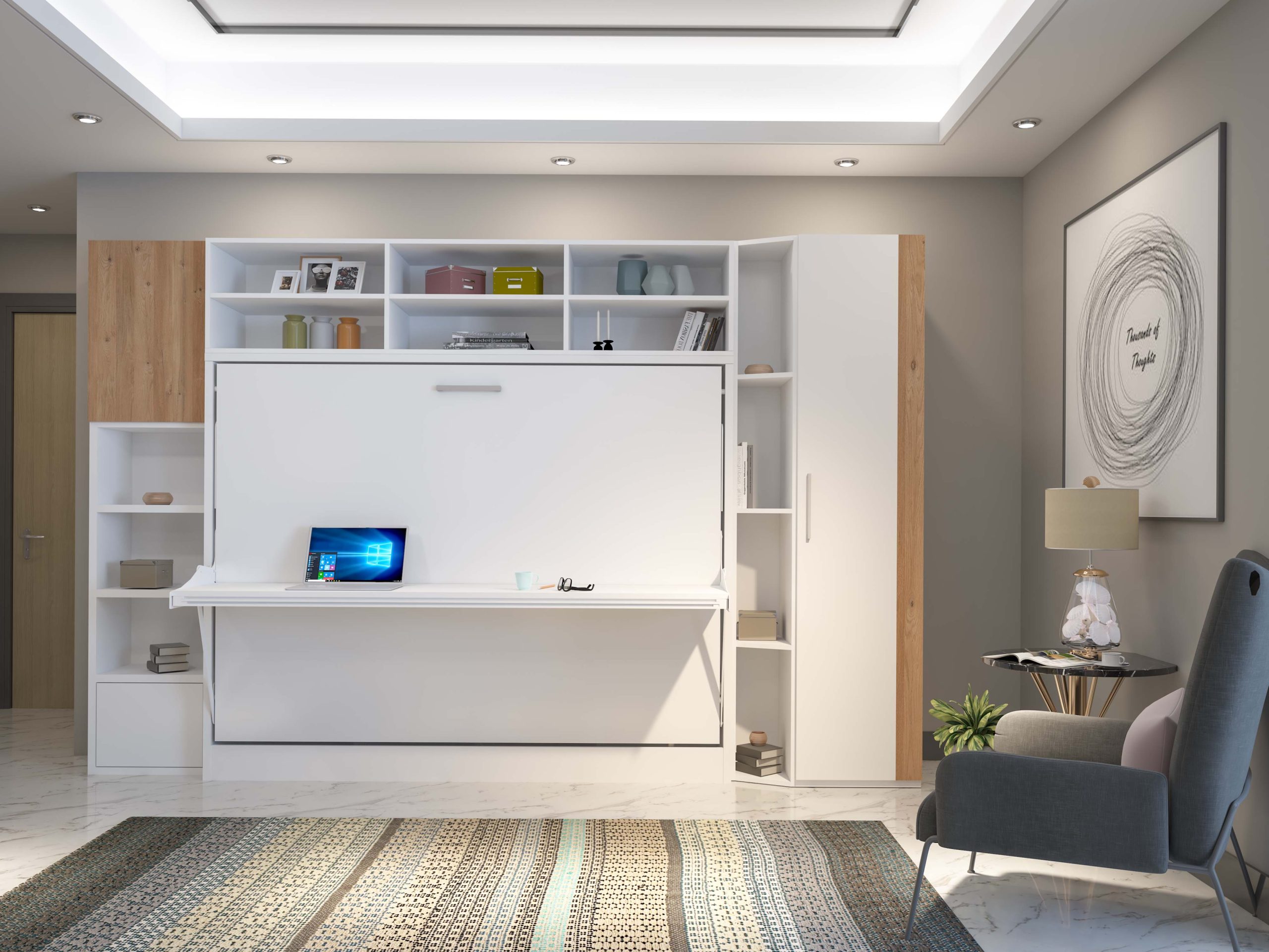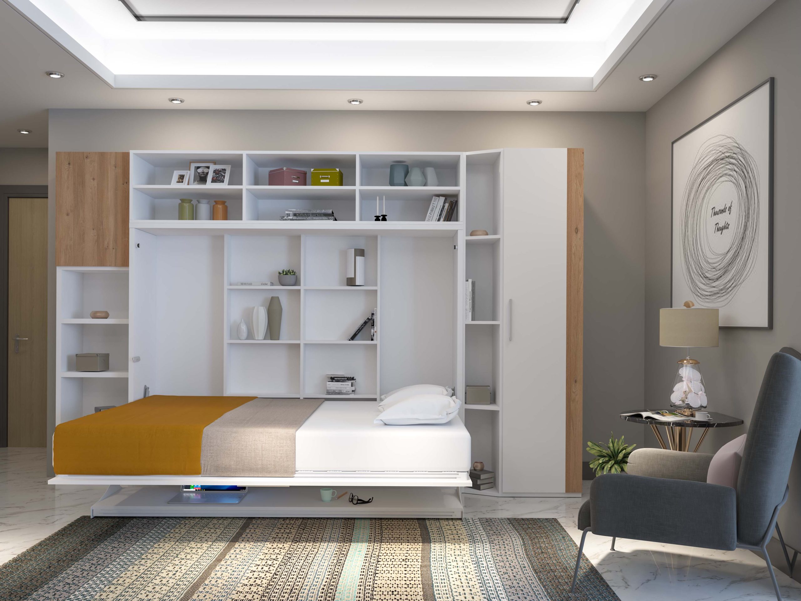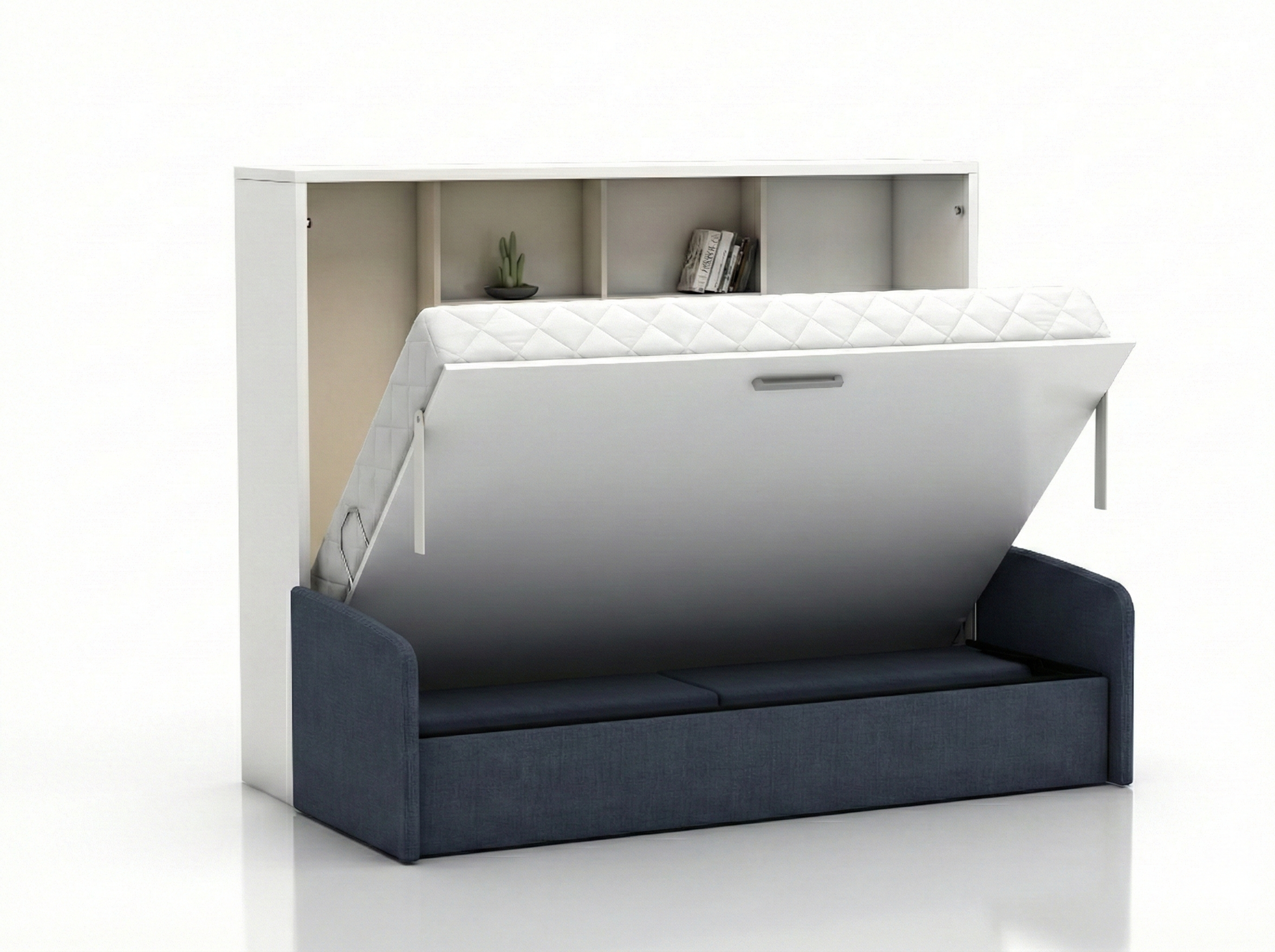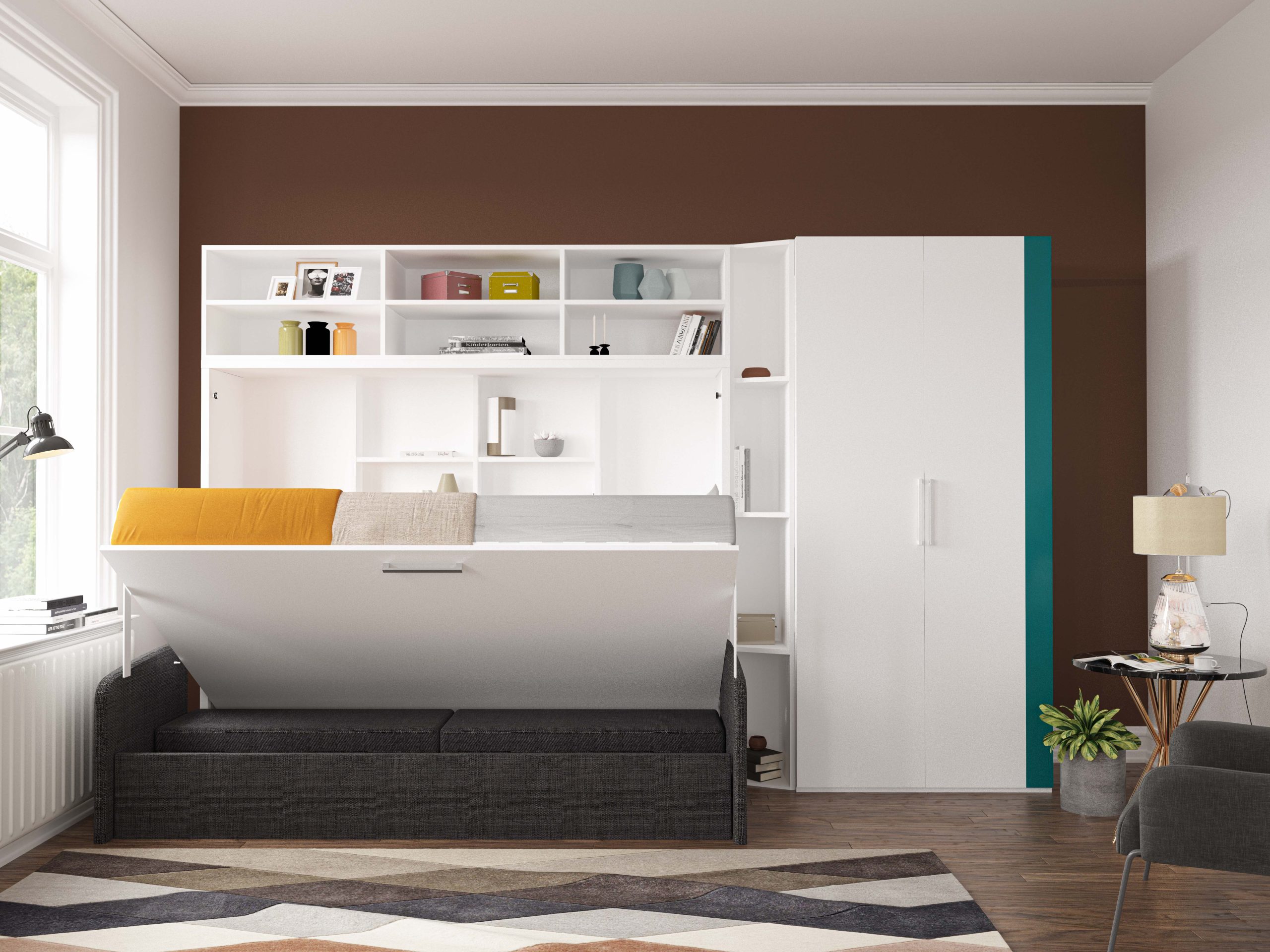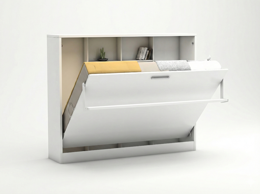 The internal support structure of the wall bed is designed to function as shelving, providing practical storage space.