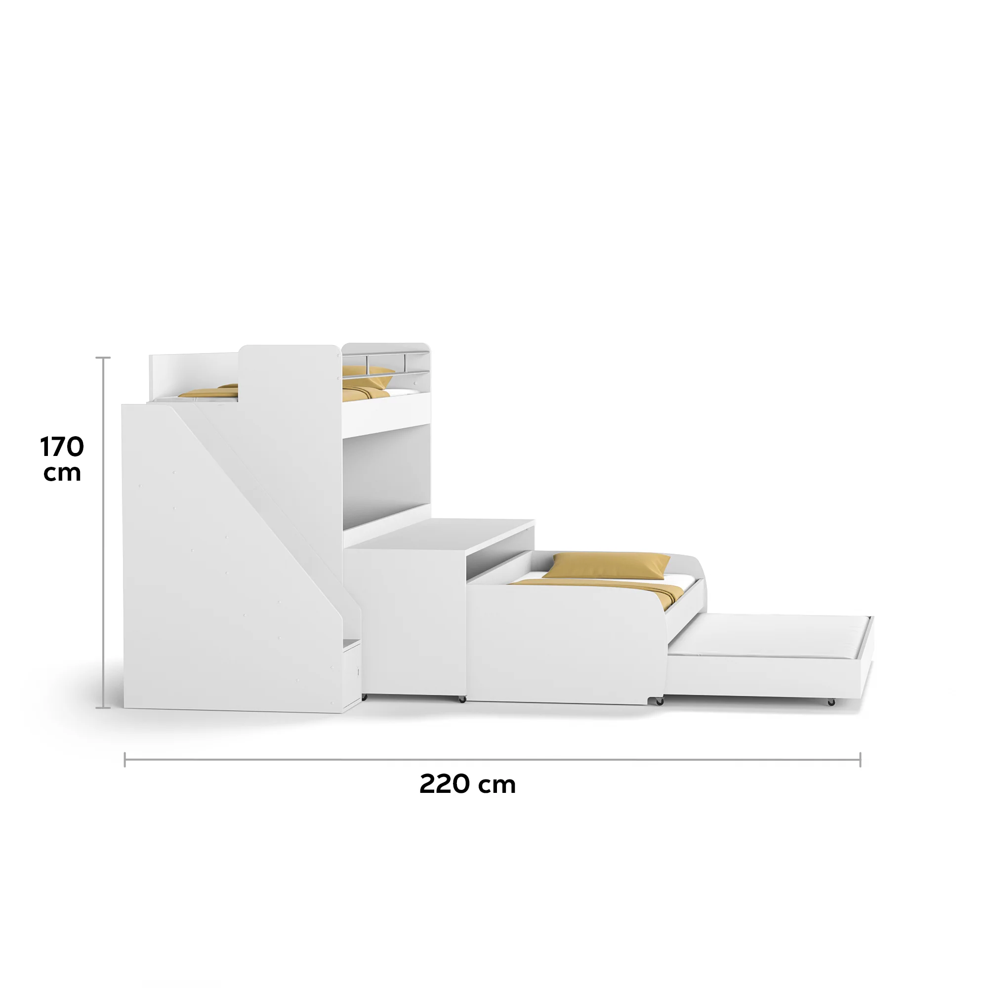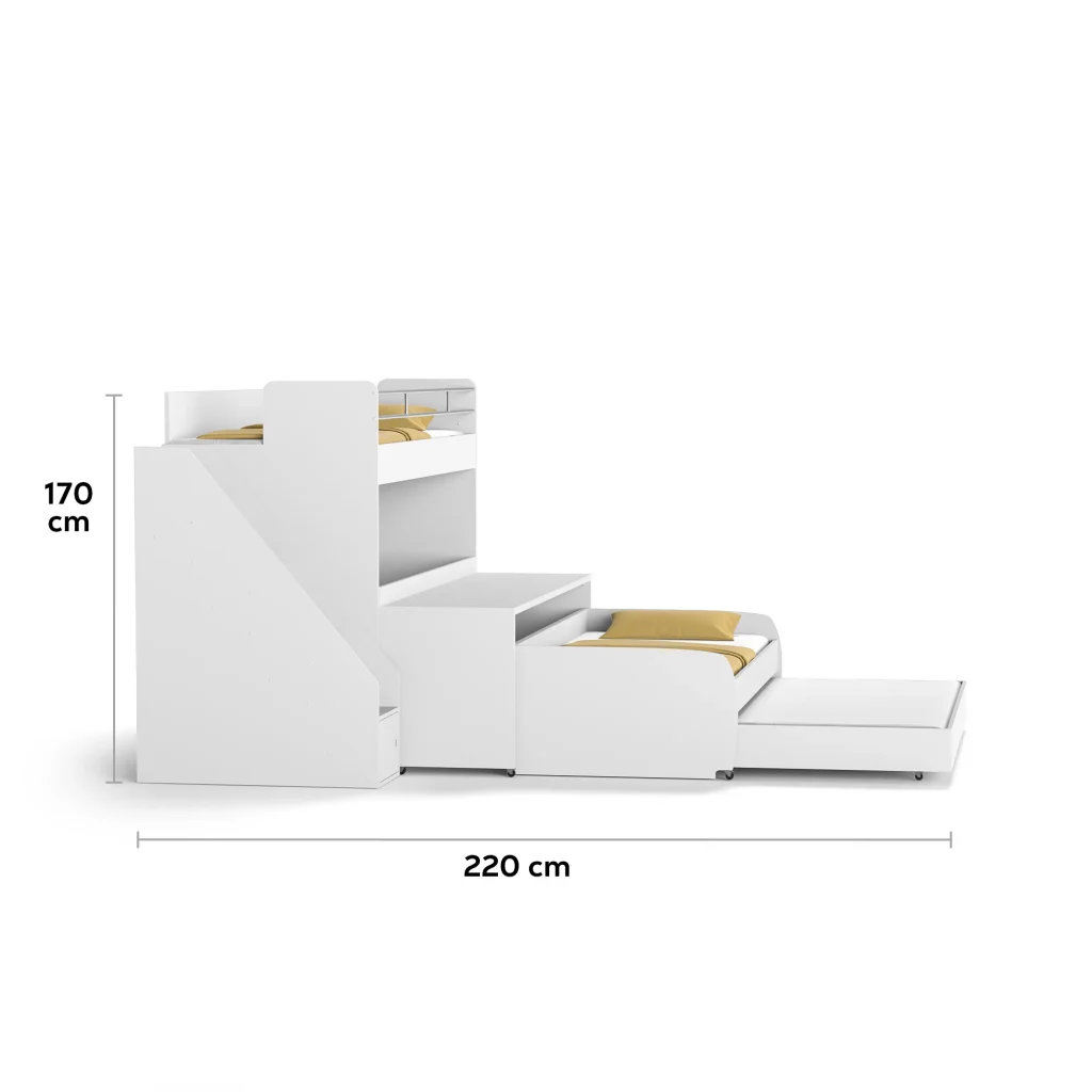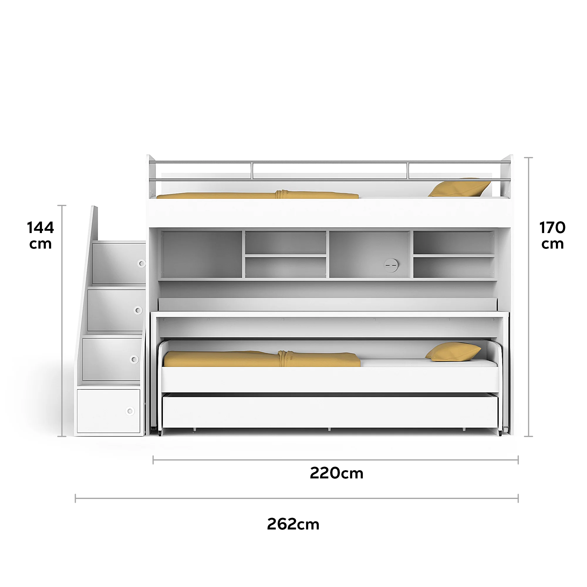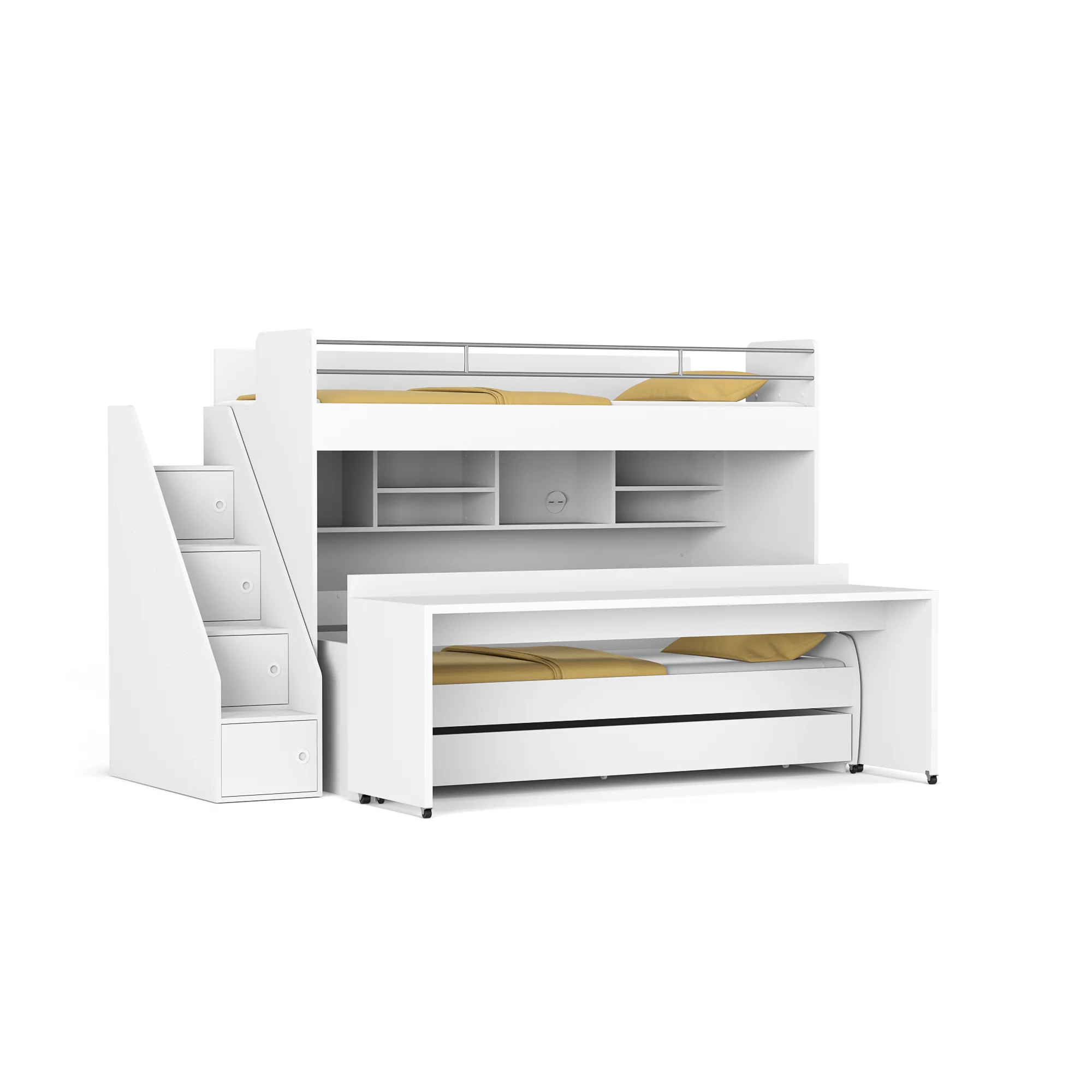 Introducing the Bel Mondo Long Single Loft Bed with Desk Set, the ultimate space-saving solution that offers 4-in-1 functionality. This stunning and durable piece brings incredible versatility to any room. The top bunk accommodates your choice of a single or long single mattress. A pull-out trundle provides extra storage or sleeping space, while open shelves on the back wall keep essentials within reach. A roll-away desk that offers flexible work or entertainment areas, and a storage step ladder is included for easy access. The Bel Mondo Long Single Loft Bed’s ingenious design maximises functionality without compromising on style. This bed is a kid’s dream and perfect for holidays and having guests over. Explore our Bel Mondo Range: four functions, one stylish solution.