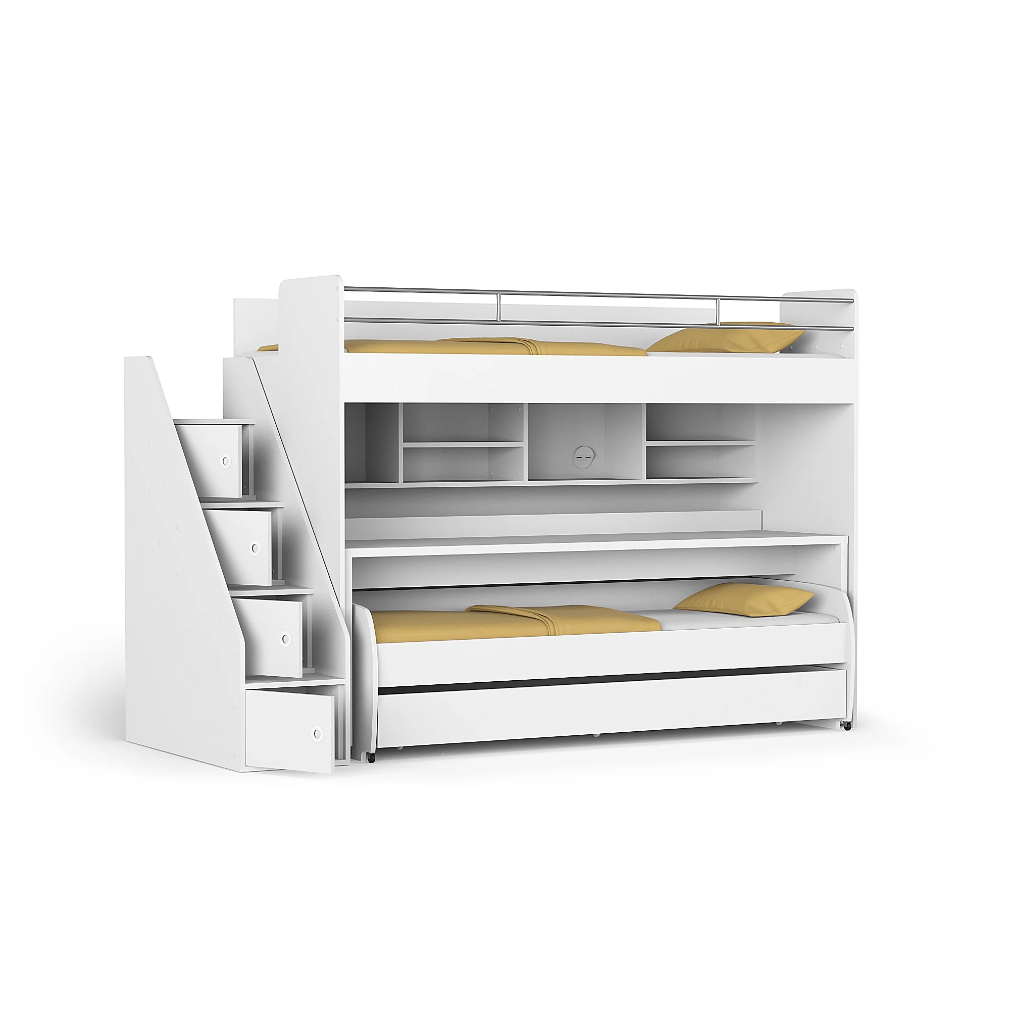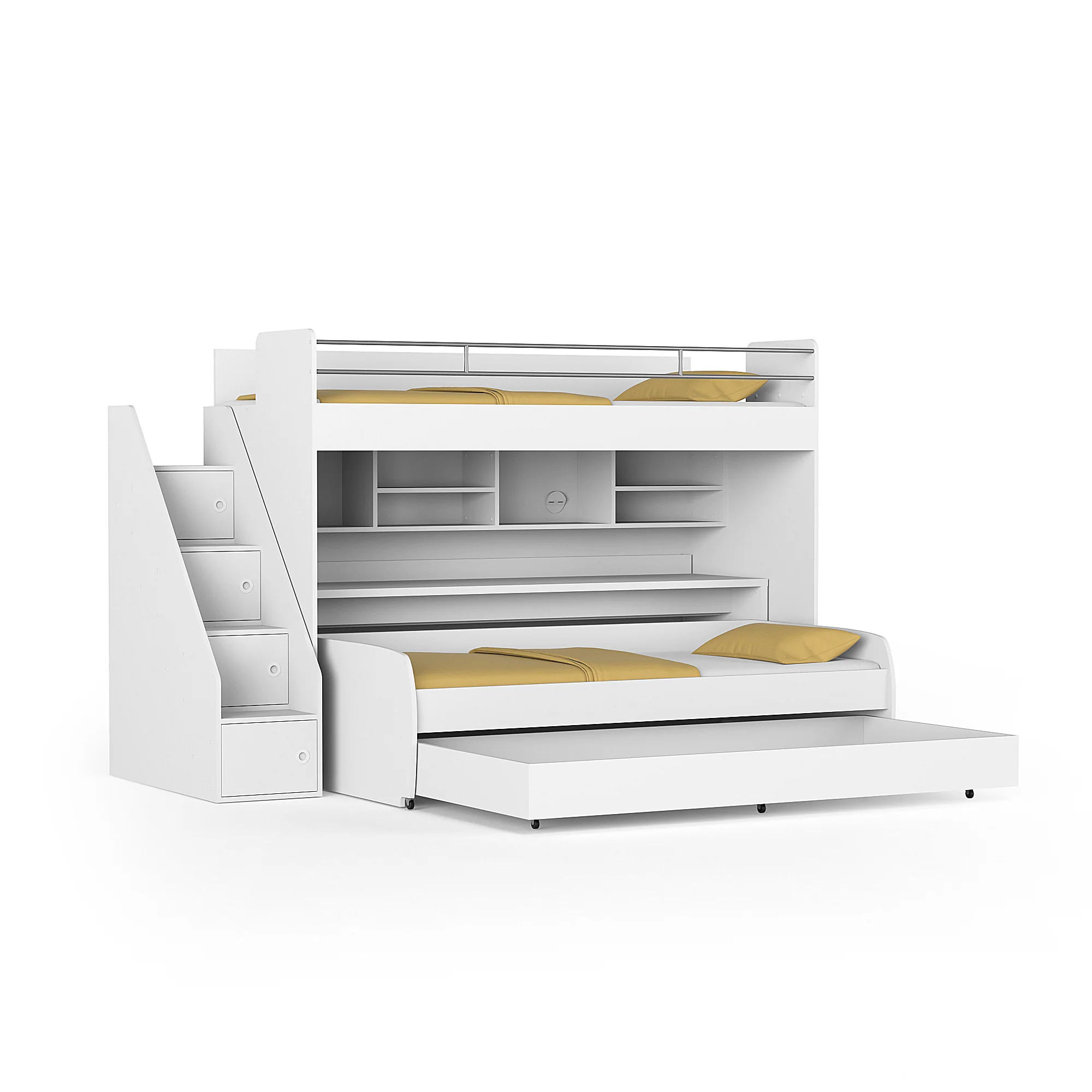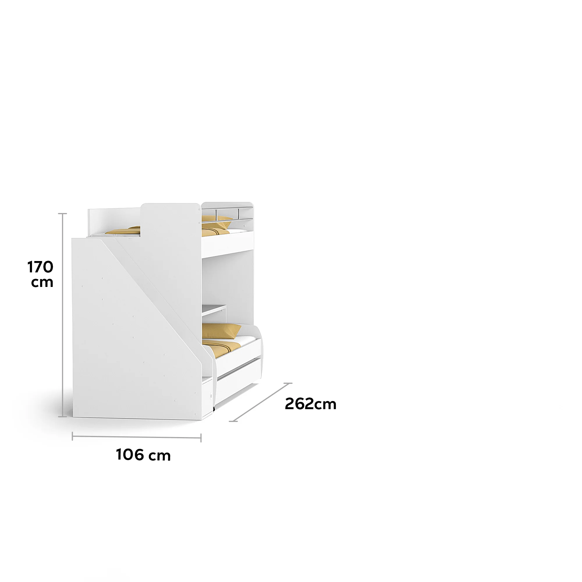 Introducing the Bel Mondo Long Single Loft Bed with Desk Set, the ultimate space-saving solution that offers 4-in-1 functionality. This stunning and durable piece brings incredible versatility to any room. The top bunk accommodates your choice of a single or long single mattress. A pull-out trundle provides extra storage or sleeping space, while open shelves on the back wall keep essentials within reach. A roll-away desk that offers flexible work or entertainment areas, and a storage step ladder is included for easy access. The Bel Mondo Long Single Loft Bed’s ingenious design maximises functionality without compromising on style. This bed is a kid’s dream and perfect for holidays and having guests over. Explore our Bel Mondo Range: four functions, one stylish solution.