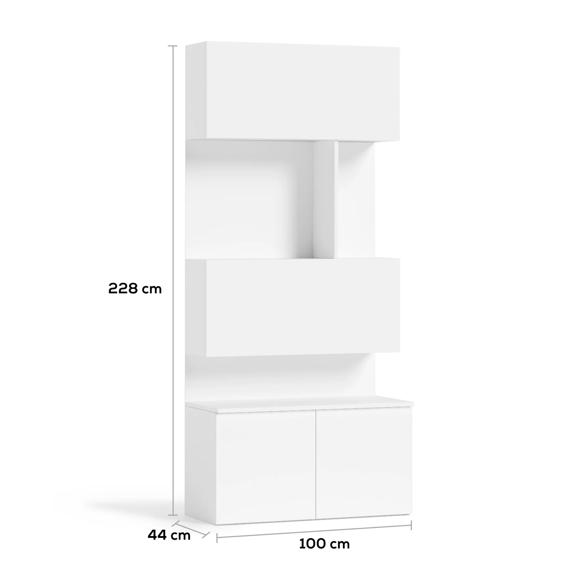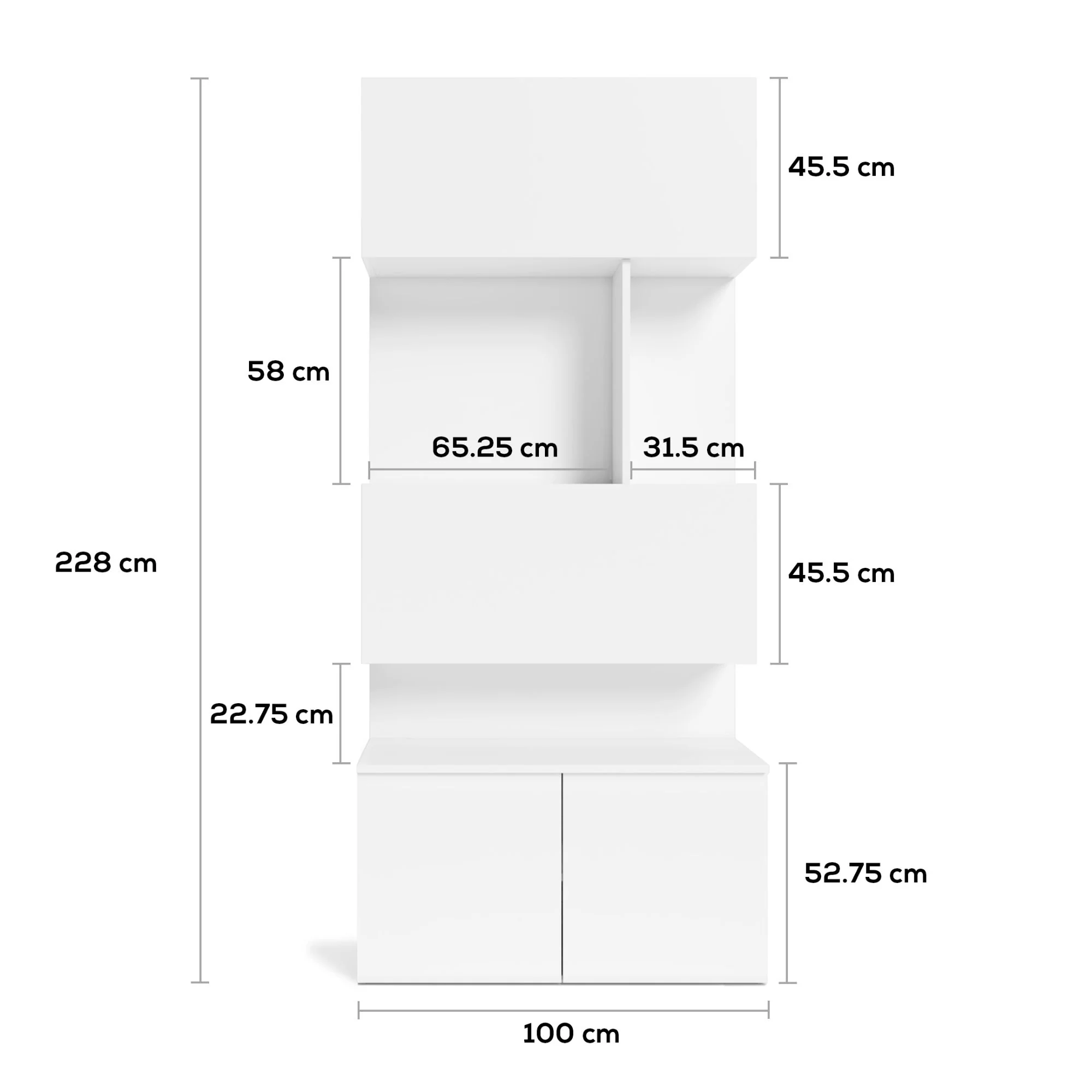 Accessible and Smart Storage: The storage area in the lower section is designed with a dual-access door system, opening from both the front and the top. Thanks to the gas-spring top door, you can effortlessly access the inner compartment even if there is another piece of furniture, like a sofa, placed right in front of the module. The removable shelf inside creates a flexible storage area for items of various sizes.